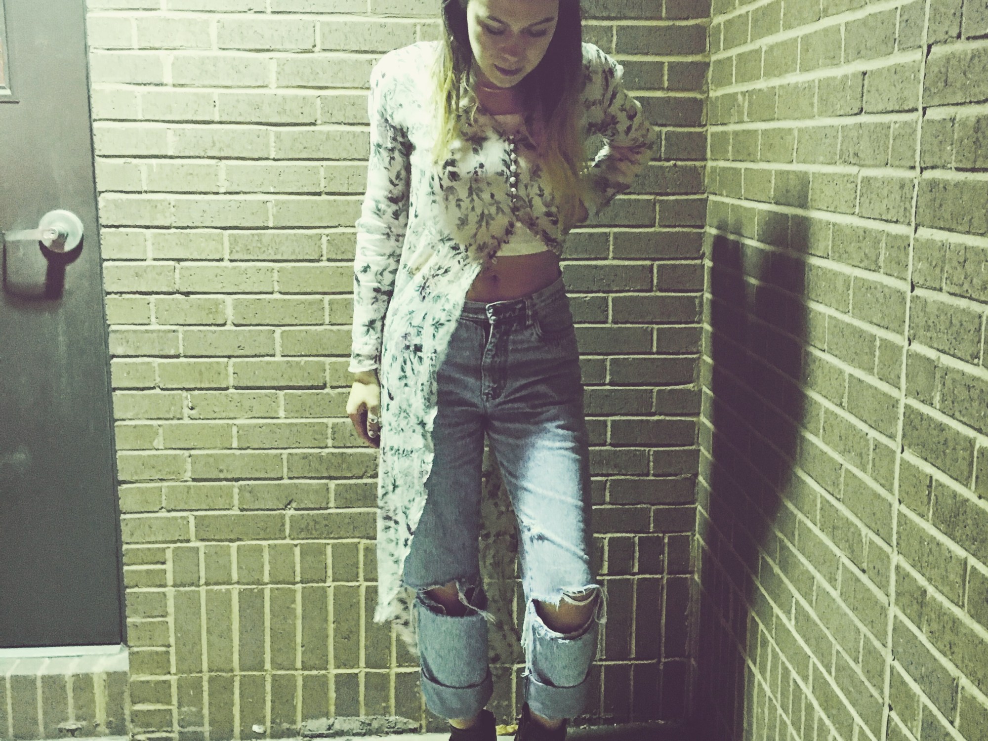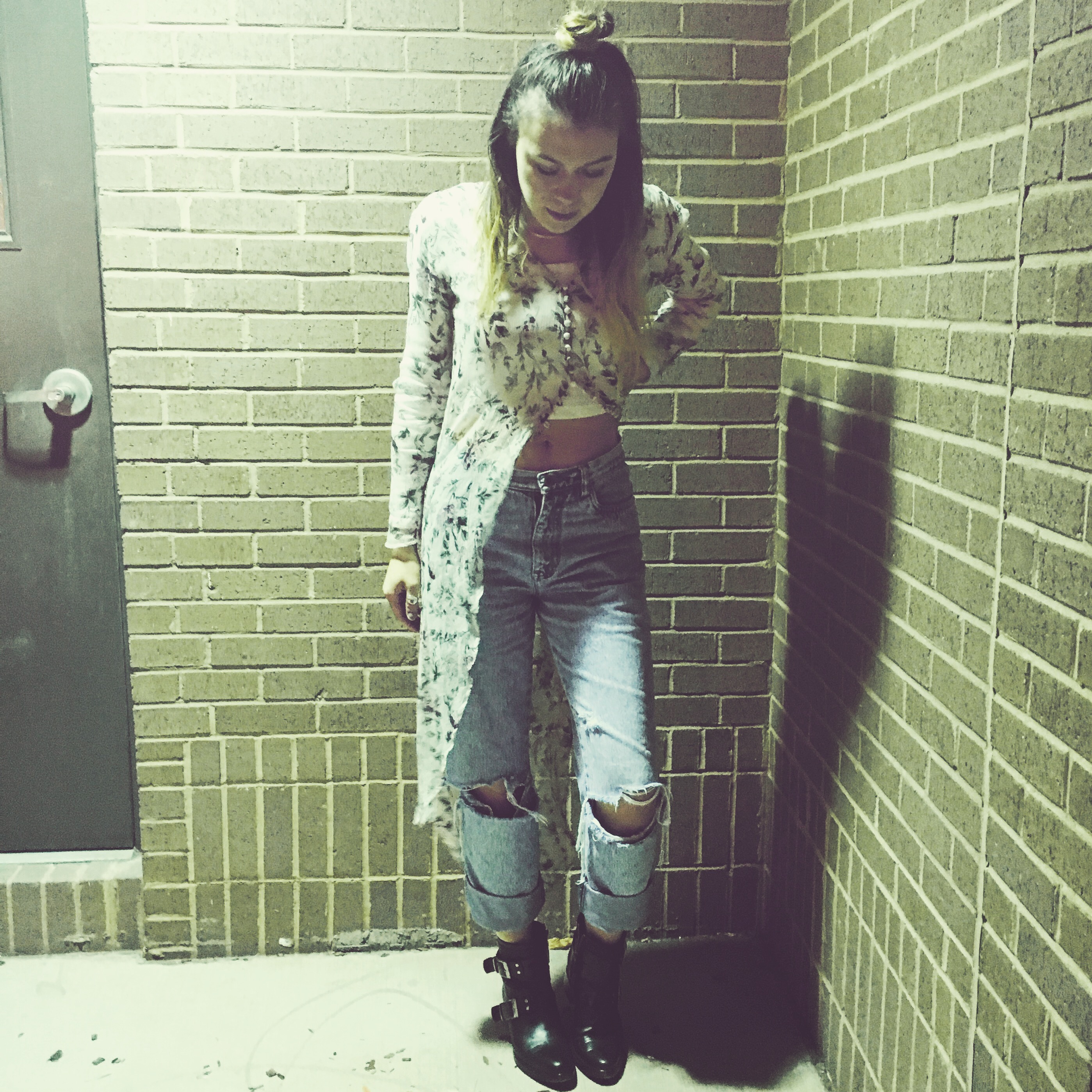 While Kurt is rocking a mohair mixed sweater (that sold for the price of four years of college tuition) in his look, I decided to pair my vintage boyfriend jeans that I have ripped up with a ribbed long sleeve crop top underneath a hi-lo floral blouse with little intricate buttons going up the front. Although it is hard to see here, I’m wearing one of my favorite silver chain chokers that is so simple and delicate. As per usual, I’ve paired this look with my signature black moto boots and messy hair with a top knot.